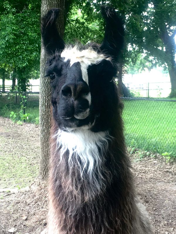 Justin is the gentle giant. He is good natured and low key. He was a beautiful dark black llama when he was young. Sadly, he is graying like the rest of us but he is still quite handsome. He definitely wants his llama chow but waits his turn. The summer in Oklahoma is hot and Justin likes to cool off in the pond. Justin takes nightly strolls through the pond and he is my Loch Ness Llama.